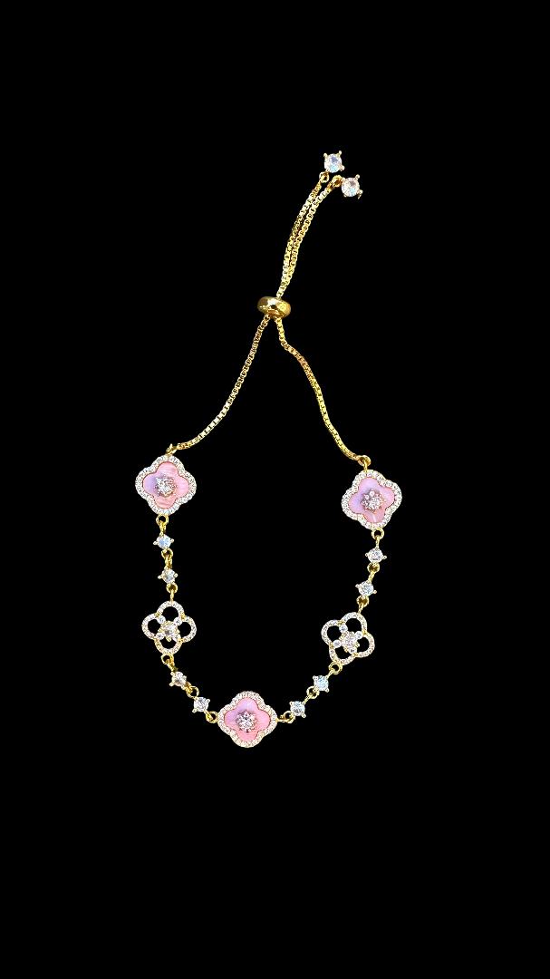 Ez a finoman megmunkált karkötő a tavasz első virágait és a holdfény csillogását idézi meg. Rózsaszín zománcvirágai és csillogó kristályai úgy ragyognak, mintha harmatcseppek táncolnának egy tündérkert hajnalán. Az arany színű láncszemek elegáns keretként ölelik körbe a kézfejet, miközben a karkötő egy különleges est vagy egy álomszerű pillanat méltó kiegészítőjévé válik.